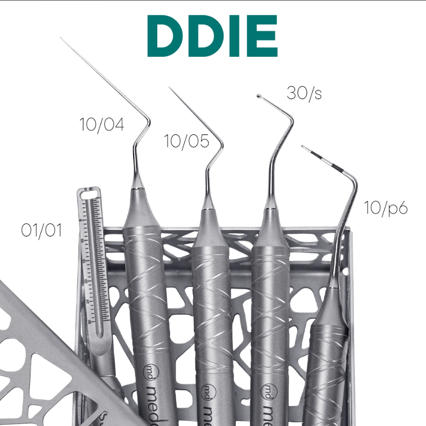 Endo Explorer DDIE-10/04, DDIE-10/05 – Kényelmes és pontos diagnosztikai vizsgálathoz. Mikro fogászati exkavátor DDIE-30/s – Szuvas fogszövet eltávolításához, valamint sürgősségi endodonciai beavatkozásoknál részleges vagy teljes pulpotómiához. Fogászati tükörnyél mérőskálával DDIE-01/01 – Gyors és egyszerű mérésekhez. Parodontális szonda DDIE-10/p6 – Tasakmélység méréséhez. Sterilizáló tálca SIM 80 s – 5 fogászati eszköz tárolására alkalmas; a speciális kialakítású rögzítők megakadályozzák az eszközök elcsúszását, és megbízhatóan védik azokat a sérüléstől szállítás közben. A készletben található eszközök külön is megvásárolhatók.