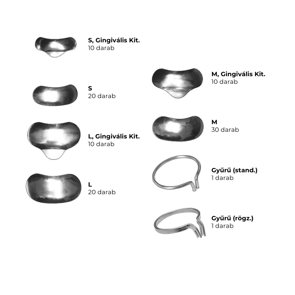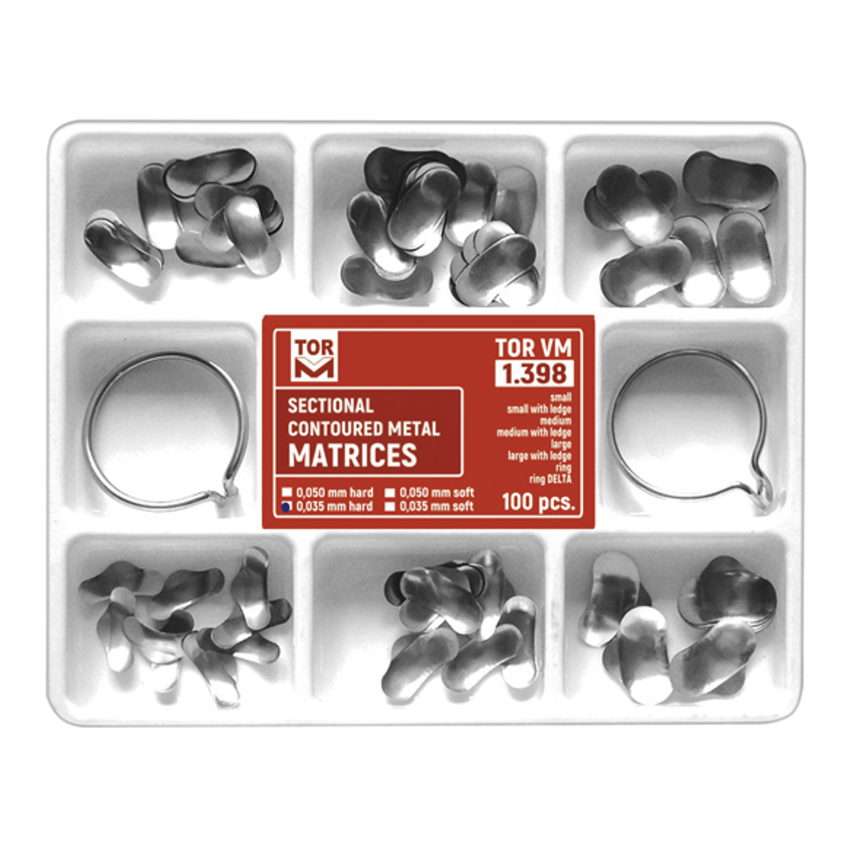 Szekcionált  35 mikronos, domborított fém matrica szett 100 darabos, 2 rögzítő gyűrűvel. A szekcionált matricák anatómikus formája  kiemelkedő kontaktpont formázást tesz lehetővé. A  matricák különlegesen rugalmas  anyaga  többszöri használatot biztosít.A készlet nemcsak minden típusból tartalmaz matricát, de két rögzítő gyűrű is található benne.